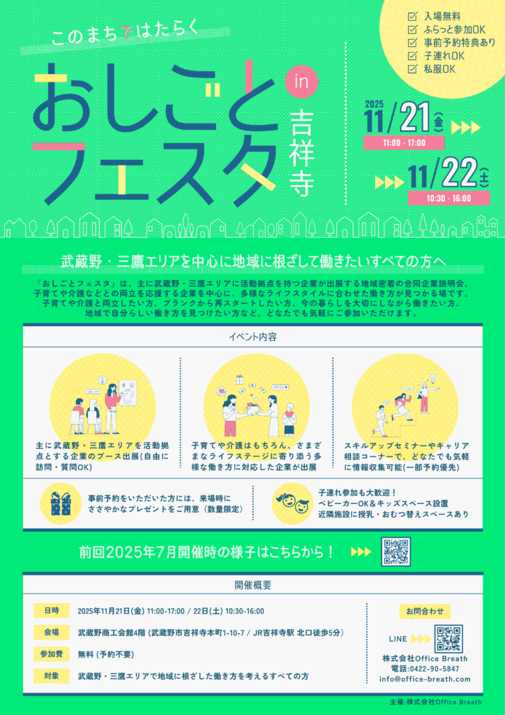 ヒトマチを運営する株式会社Office Breathは、2025年11月21日・22日、働き方・キャリアがテーマのイベント「おしごとフェスタ in 吉祥寺」を開催します。
