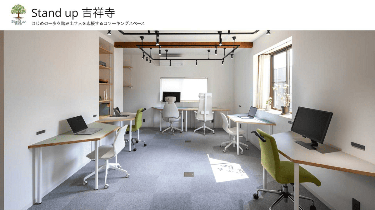 Stand up吉祥寺は、吉祥寺中道通りにある、気軽に立ち寄れるコワーキングスペースです。